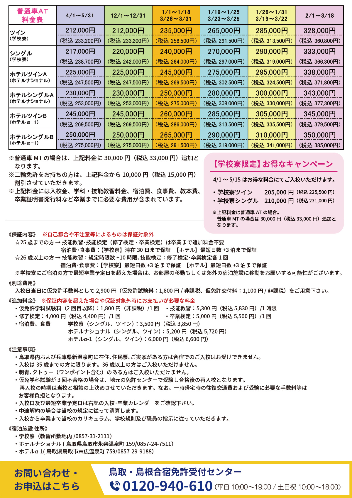 合宿中は一時帰宅ができないためスケジュールを確認し余裕をもったお日にちでお申し込みください。※仮予約は先着順にて受付けております。
